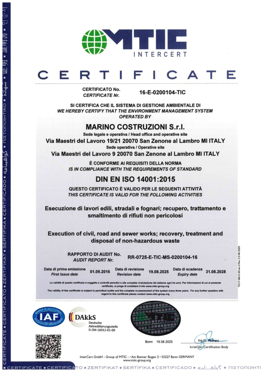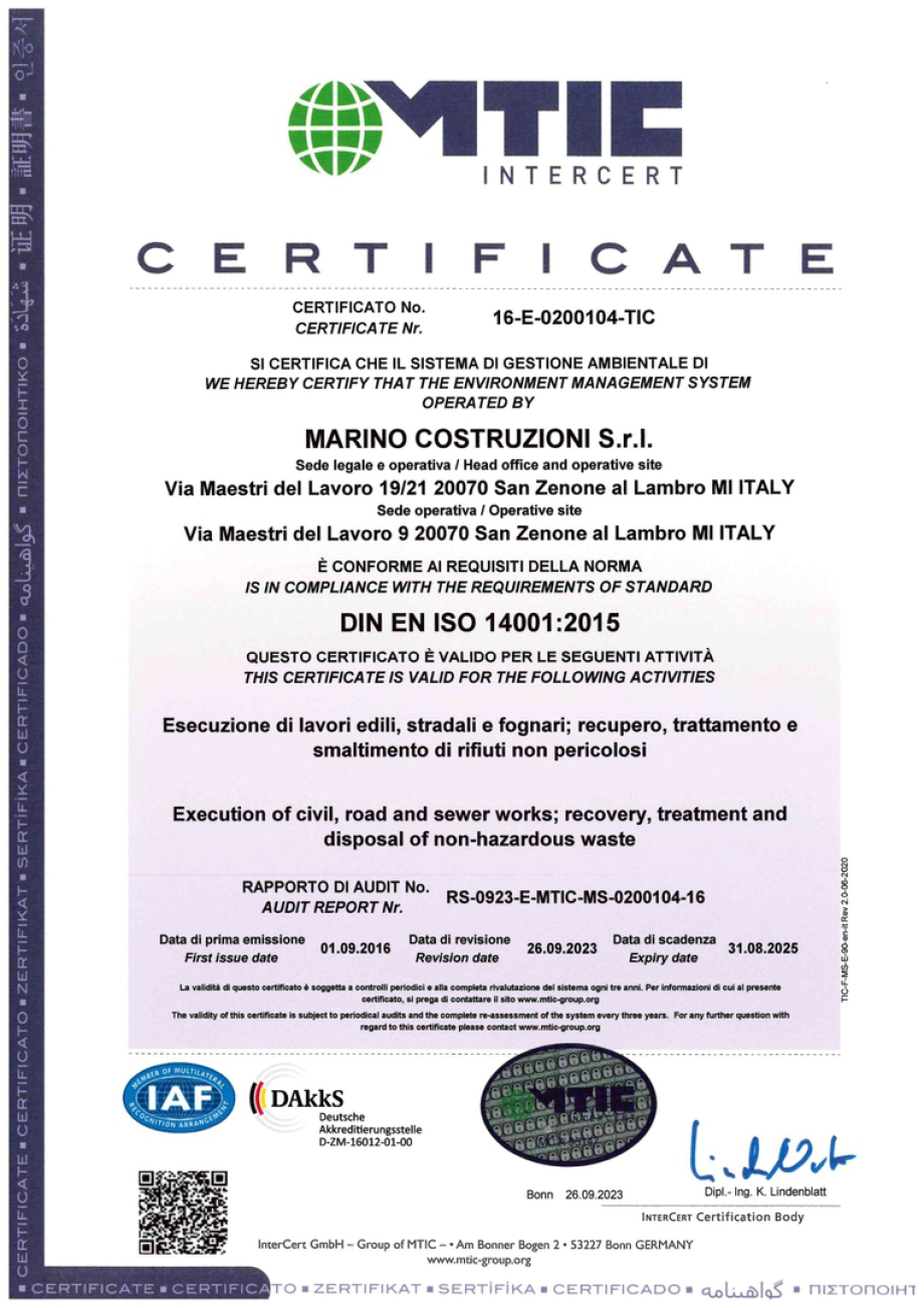 MARINO COSTRUZIONI S.R.L. è certificata ISO 14001 da settembre 2016.,abbiamo operato per radicare una cultura d'impresa che prenda in considerazione e valuti, con