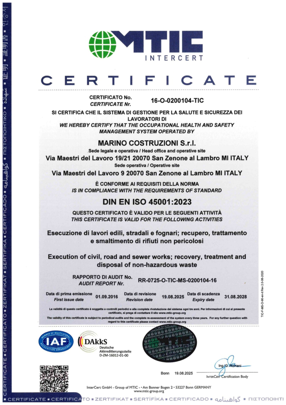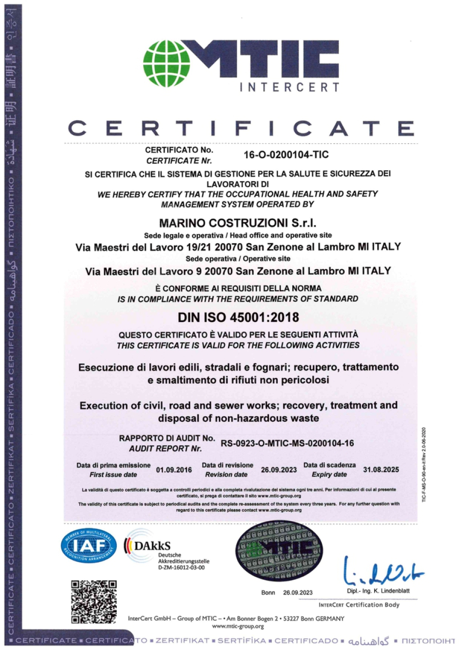 Continuando il percorso di sviluppo in azienda di Sistemi di Gestione integrati, a copertura di diversi ambiti dell’organizzazione, MARINO COSTRUZIONI SRL ha conseguito la Certificazione del Sistema di Gestione per la Salute e Sicurezza dei Lavoratori in conformità alla norma DIN ISO 45001:2018, che si aggiunge a quelle per la Qualità secondo la ISO 9001:2008 e ambientale, in accordo alla ISO 14001:2015, già attive in azienda .La nuva certificazione è stata rilasciata a seguito di una attenta e puntuale verifica sugli aspetti rilevanti dell’Organizzazione, MARINO COSTRUZIONI SRL ha voluto attestare in maniera chiara ed indipendente ai propri Stakeholder il suo impegno nella gestione della sicurezza del personale, oltre che nell’erogazione di un servizio di elevata qualità,