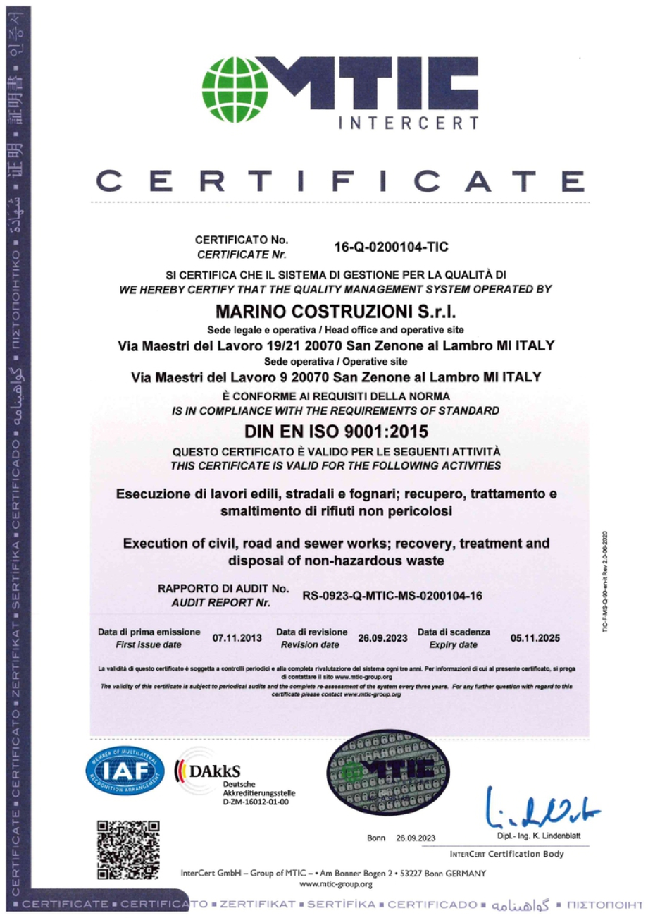 La qualità del prodotto e la soddisfazione del Cliente vengono assicurati oltre che dalla quarantennale esperienza maturata, anche dall'adozione, in tutte le fasi della costruzione, del proprio Sistema di Gestione per la Qualità conforme alla normativa europea UNI EN ISO 9001:2015.Certificato n. 16-Q-0200104-TIC rilasciato da MTIC