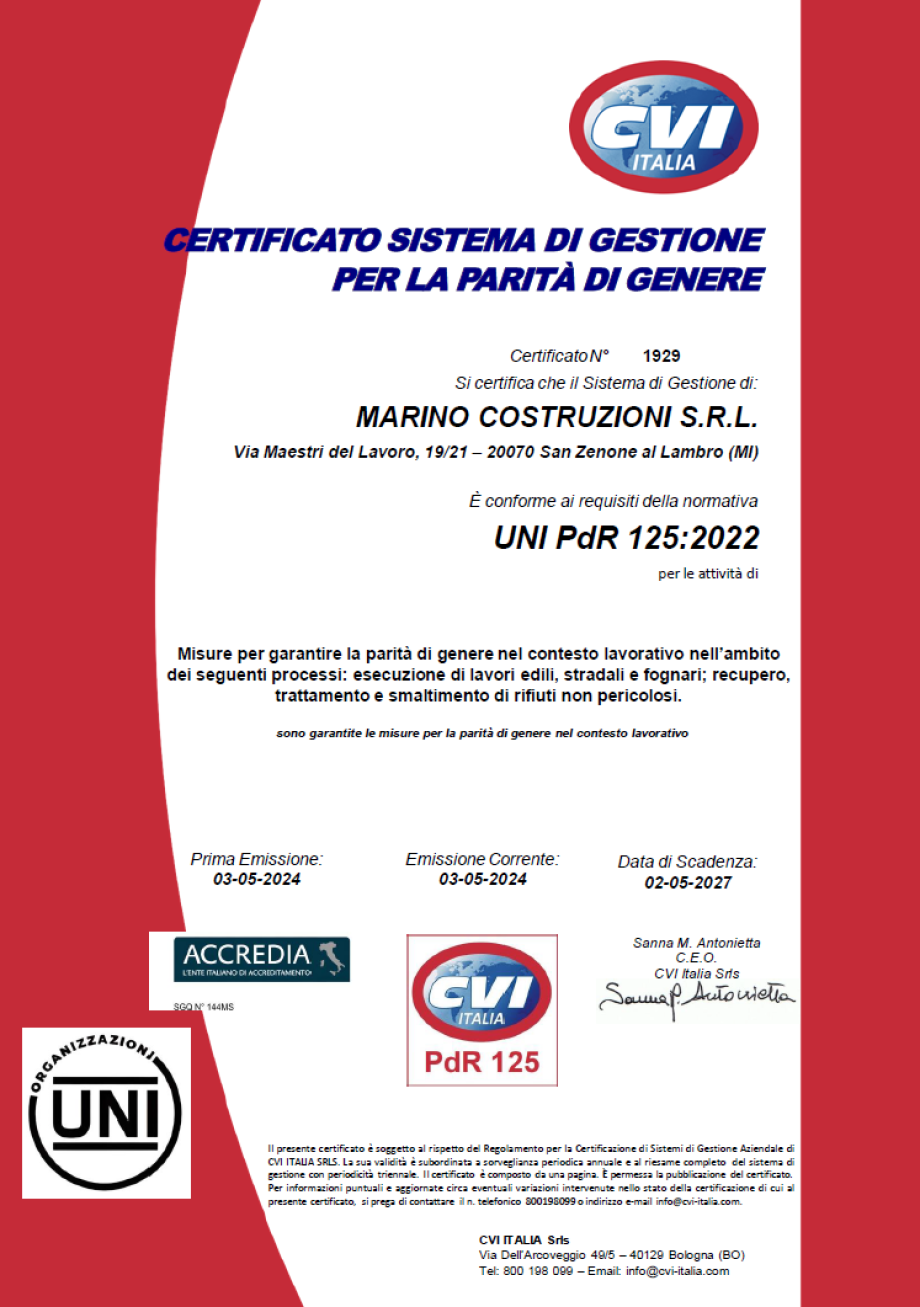 L’impegno di MARINO COSTRUZIONI S.R.L. è volto a preservare il valore delle persone, affinché ognuno si senta incluso e possa dare il meglio di sé sentendosi veramente parte integrante della società, si sostanzia in una strategia di sviluppo e gestione delle risorse umane, in grado di promuovere una cultura inclusiva per valorizzare l’unicità delle persone e l’accesso alle medesime possibilità di crescita professionale a prescindere dal ruolo ricoperto nell’organizzazione.